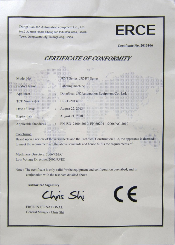 為使公司產(chǎn)品盡快進軍歐洲市場,擴大出口業(yè)務(wù),并提升我司對國際市場產(chǎn)品質(zhì)量的要求。通過努力,高臻智能公司旗下不干膠貼標(biāo)機及熱熔膠貼標(biāo)機系列產(chǎn)品已于2013年8月順利通過了CE認(rèn)證。獲得得了認(rèn)證產(chǎn)品的CE認(rèn)證《符合性證書》及相關(guān)測試報告。為公司主導(dǎo)產(chǎn)品全面開拓歐洲市場提供了可靠的保障。