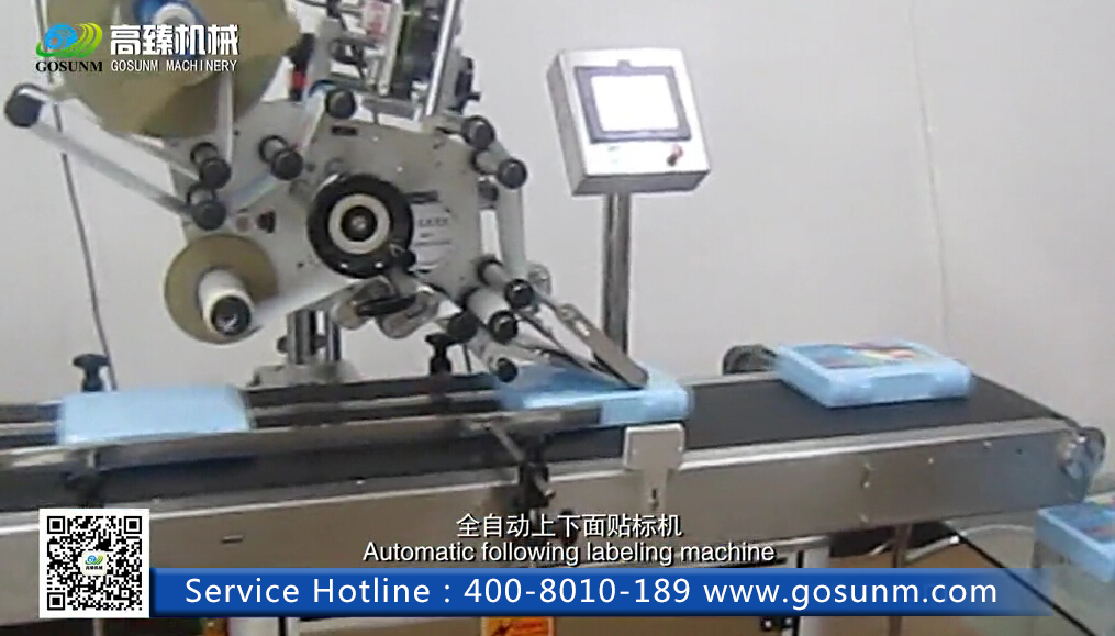 全自動上下面貼標機操作過程比較簡單,首先工作人員將產品放在流水線上,機器檢測到有產品經過,在適當時刻送出標簽貼附在產品的上平面位置上