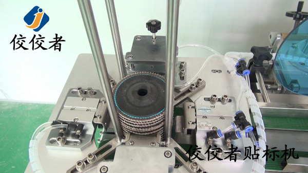 當(dāng)砂輪片被送到機(jī)器中間貼上標(biāo)簽時(shí),貼標(biāo)還并未完全結(jié)束,砂輪片還要經(jīng)過(guò)下圖這個(gè)圓滾滾的柱體的適當(dāng)碾壓才算可以,這個(gè)圓柱體在其他全自動(dòng)貼標(biāo)機(jī)上也有不同形式的出現(xiàn),只是其大小和樹立姿態(tài)不同,但都有個(gè)共同的目的,就是讓標(biāo)簽更緊實(shí)地貼在產(chǎn)品上,如下圖: