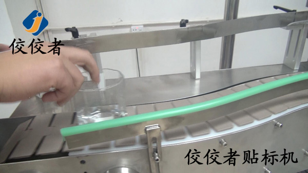 下圖展示的是工作人員將需要貼標的玻璃杯放在方便拿取的位置以增加貼標的效率,此時有一個步驟在圖片中沒有展示出來,那就是接通電源.之后需要做的就是將玻璃杯放在輸送帶上,.然后調整好角度,此時貼標過程已經完成.看似只有一秒鐘的時間,在這個時間中,機器進行了一系列的工作,測物、測標、剝標,側面貼標、下面貼標,此時貼標頭貼標,到指定位置,.至此,貼標過程就已經完成了. (操作過程:放產品—>貼標并覆標)—>取出已貼標產品。)如下圖。此圖展示為手工放產品,也可以接流水線,所有與產品接觸的地方為塑膠(非金屬),保證產品輸送過程,起到緩沖,減少振動,保證在貼標過程中產品合格,玻璃易碎難點。